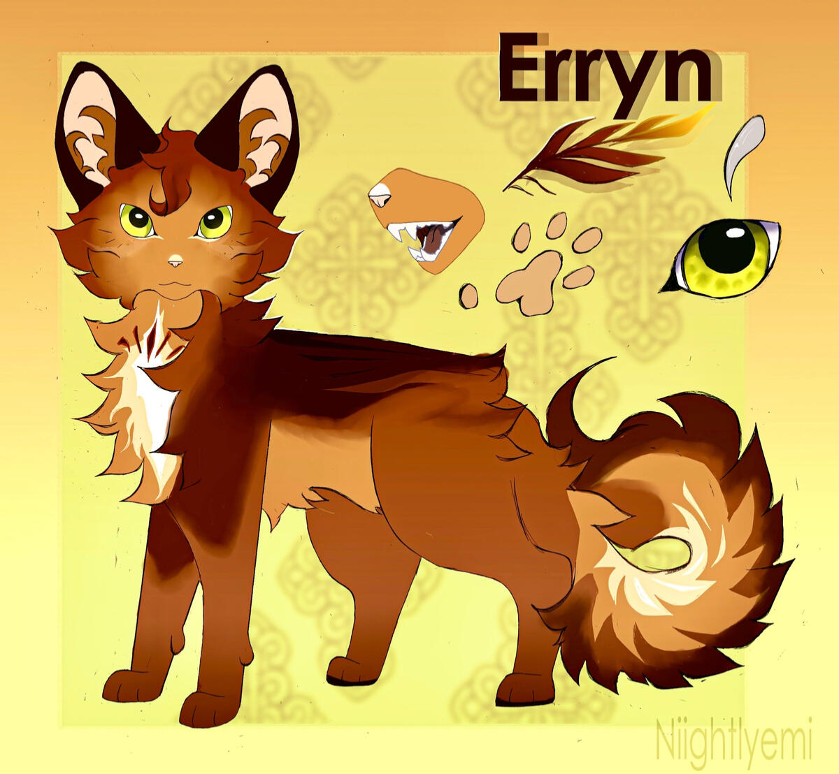 βThose trees are tree-mendous!ββββPERSONALITY:Erryn is a kindhearted, joyful, and loving feline with the desire for adventure at all times. Heβs overly optimistic and often sees the world as a lovely and kind place, heβs often called a ray of sunshine by other cats due to his personality. Erryn often takes every negativity he faces with a pinch of salt, and is always there to comfort those he loves when heβs needed. He loves to joke around and will take any chance to make a silly pun.Erryn is an average fighter, and not the smartest though he makes up for it for his boldness and ability to learn new things quickly. He prefers not to fight but rather talk things out.βββπππππHe dwells in a deep forest and always passes by the lake to ponder what lies beyond. Errynβs curiosity and passion for exploring often leads him to unexpected and questionable situations.Erryn lives beyond the lake of Vinfelde. He and a small group of cats fall the forest next to the lake home, calling a few remote abandoned human cabins and shelters their home as well as the forest. He works together with the others to supply for the entire group as well as spending time adventuring the lakes shore.--------------------------------------DESIGN NOTESErrynβs base fur coat has a gradient from dark to light brown. Artistic freedom is okay and he can be also drawn without the gradient if that is easier. His chest marking is shaped like a downward arrow (often covered by long tufts of fur).(This characters story is being slowly told through Fallen infelde, as such, this page will be restricted to his base character and not his entire story.)Designer: Niightlyemi