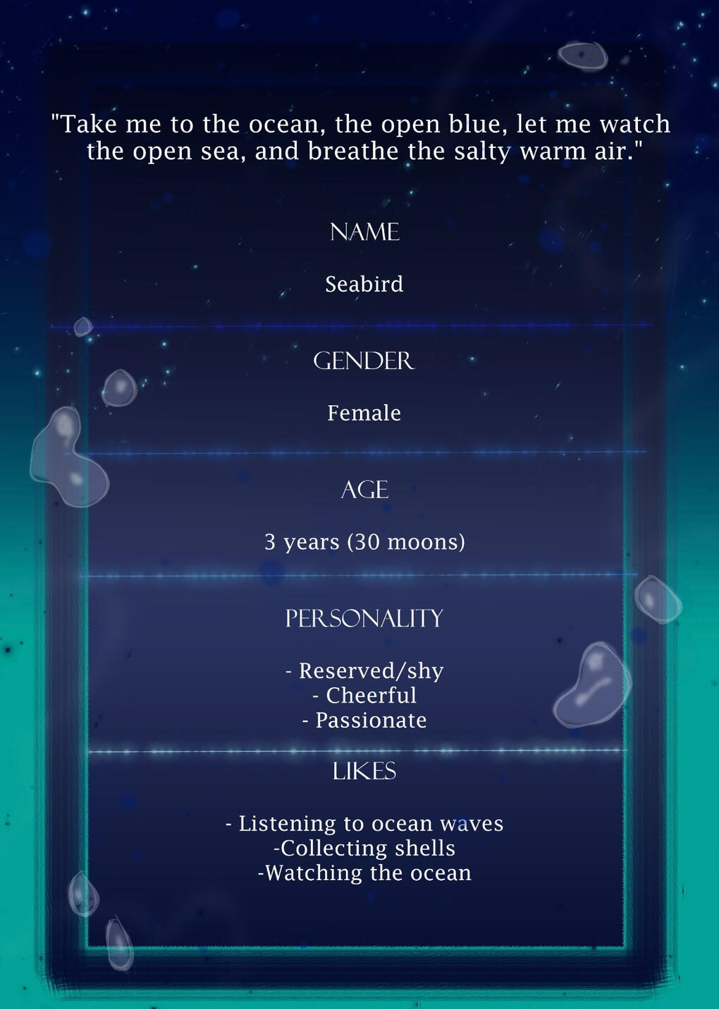 βI find comfort in the rhythm of the sea.βββ-πππππSeabird is a reserved feline inspired by the ocean, and the beach. She is not part of any storyline, rather a cat that travels discovering new oceanic landscapes and new bodies of water. She enjoys listening to the sound of waves and loves the salty smell of the sea. She is a quiet feline that likes to travel alone, she fears extremely deep water but loves splashing about when the water is shallow.---------------------------------DESIGN NOTESSeabird has gradients in her stripe representing the depth of water. Artistic freedom is okay and she can be drawn with a solid stripe color as well. Her stripes can also glow in the dark if that is desired. She has fluffy, long fur that often curls if she has just been in water.Designer: Niightlyemi